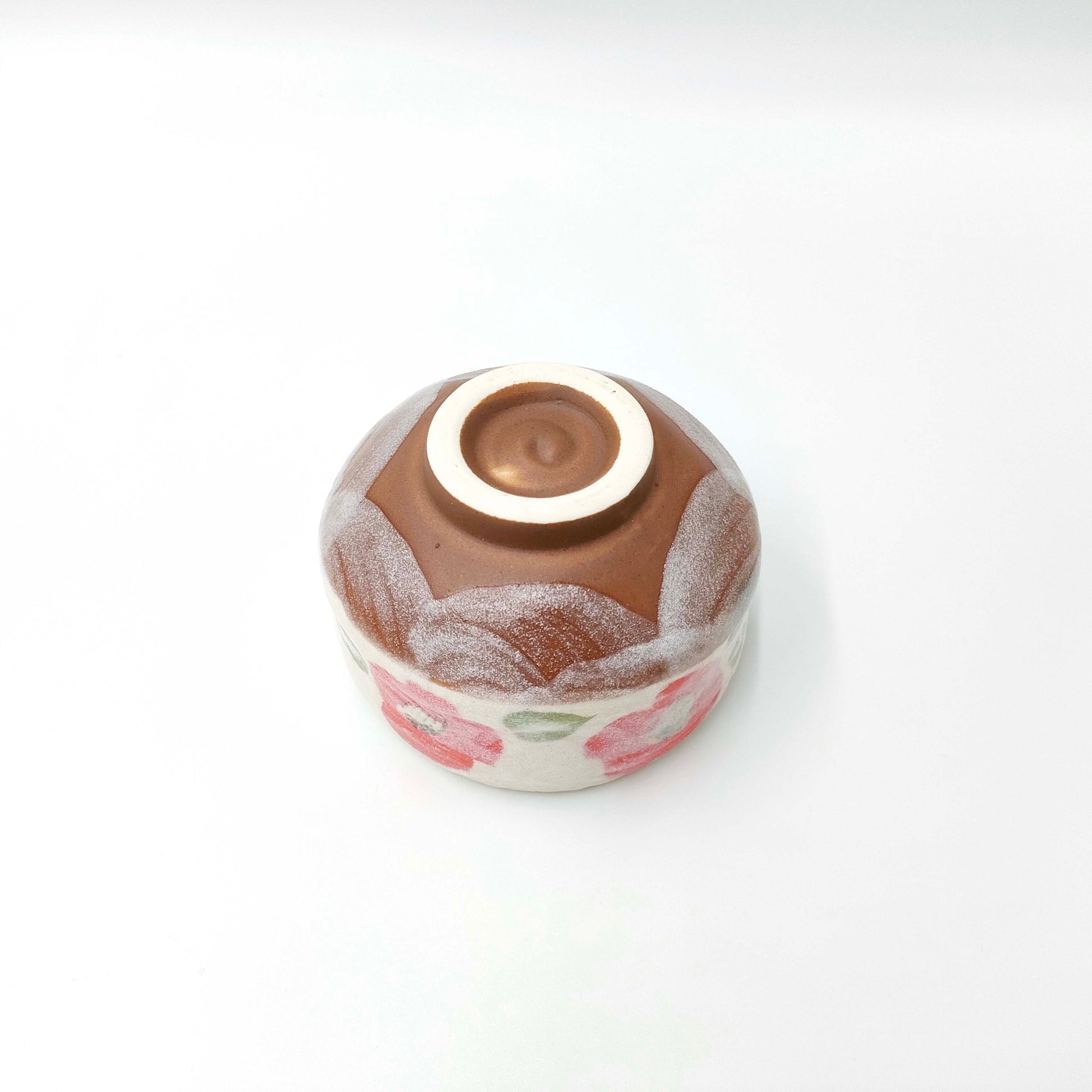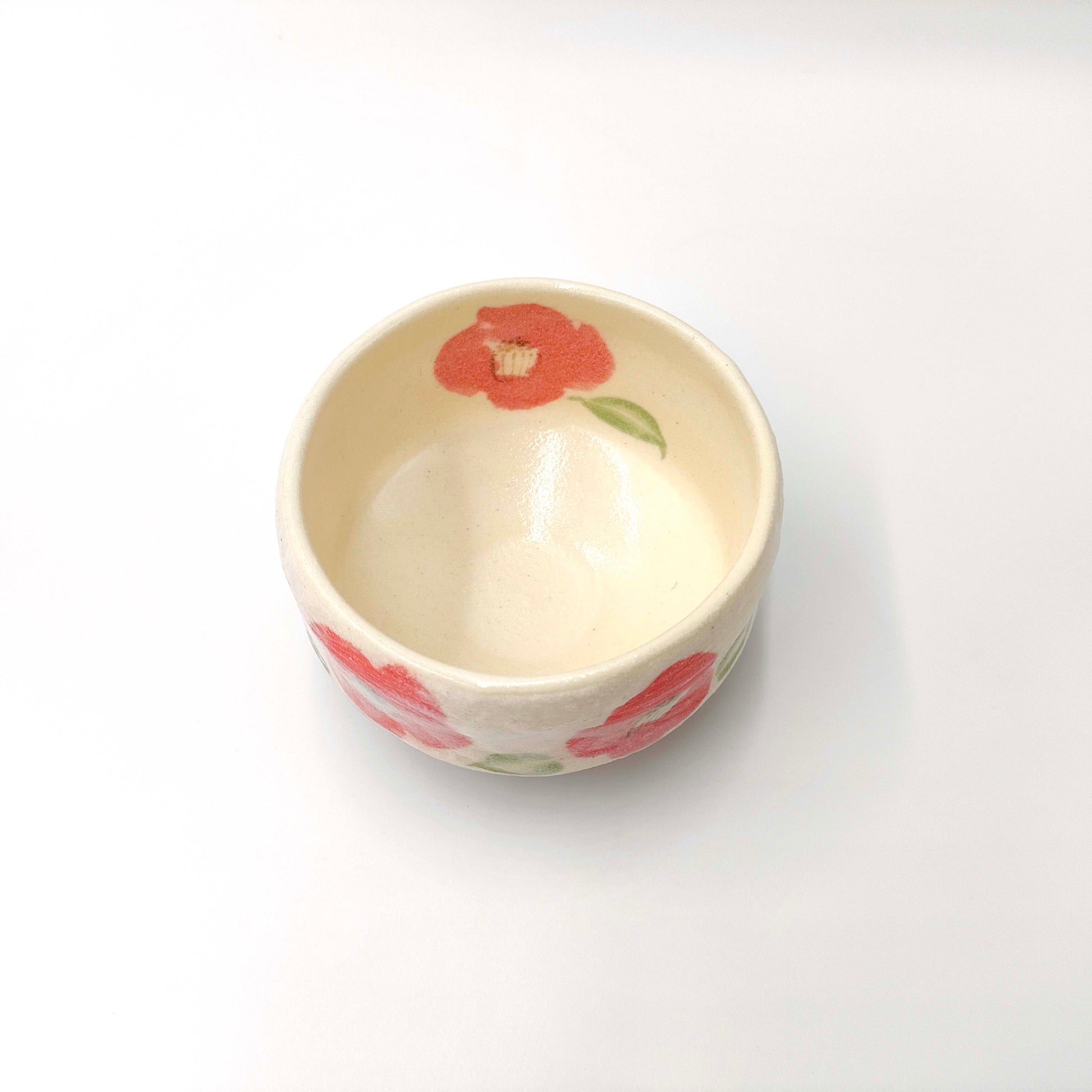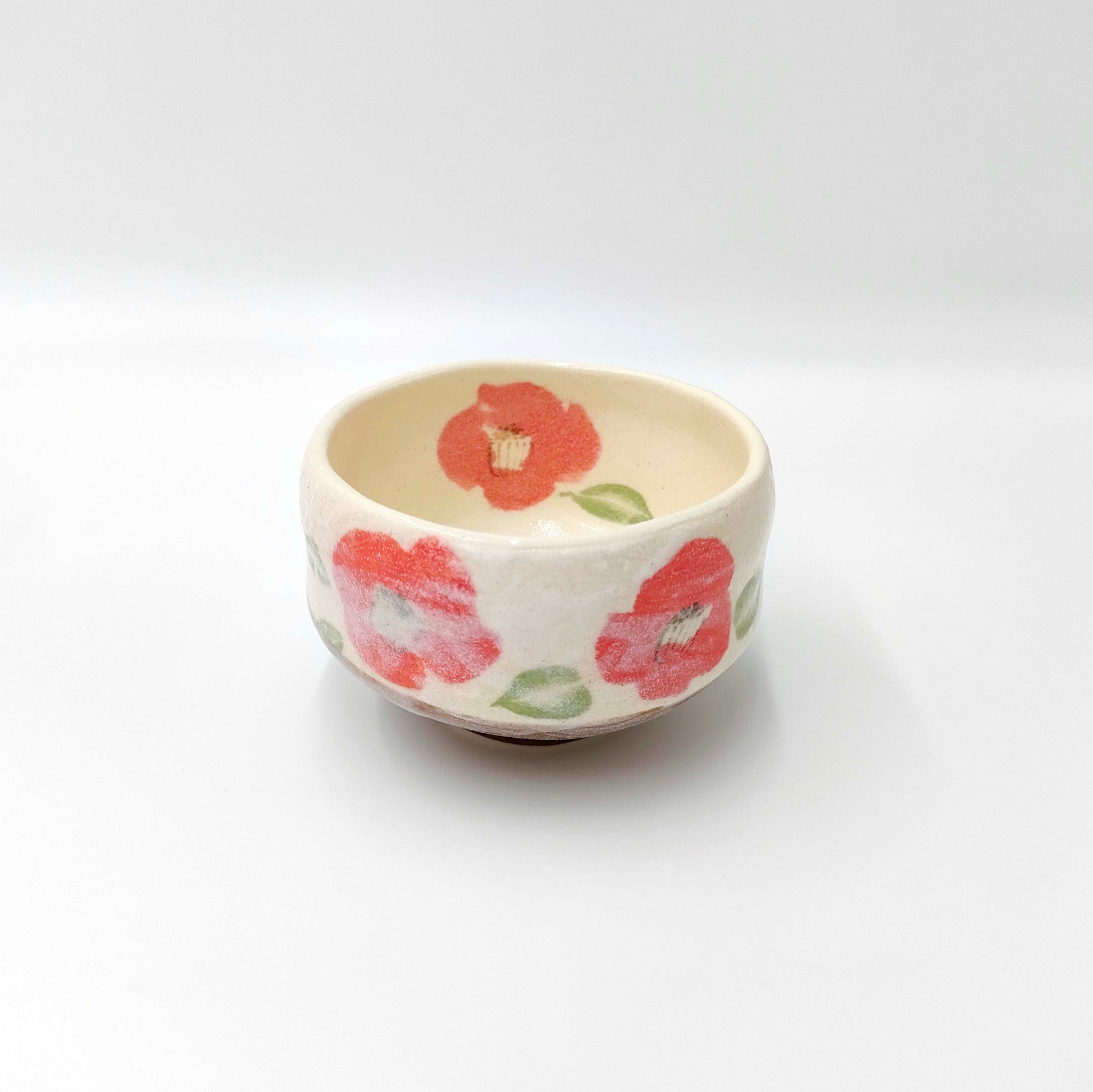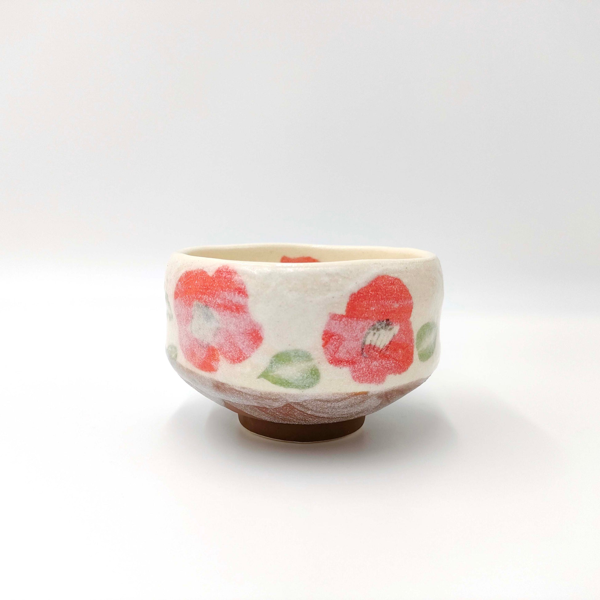 A classic Japanese chawan handcrafted in Mino, this matcha bowl is beautifully adorned with delicate red tsubaki—Camellia japonica—gracefully arranged around the exterior. The blossoms, rich in seasonal meaning, are rendered with depth and warmth, offering a striking contrast to the white glaze.A timeless vessel for those who appreciate the enduring elegance of traditional Japanese floral motifs in their matcha moments.