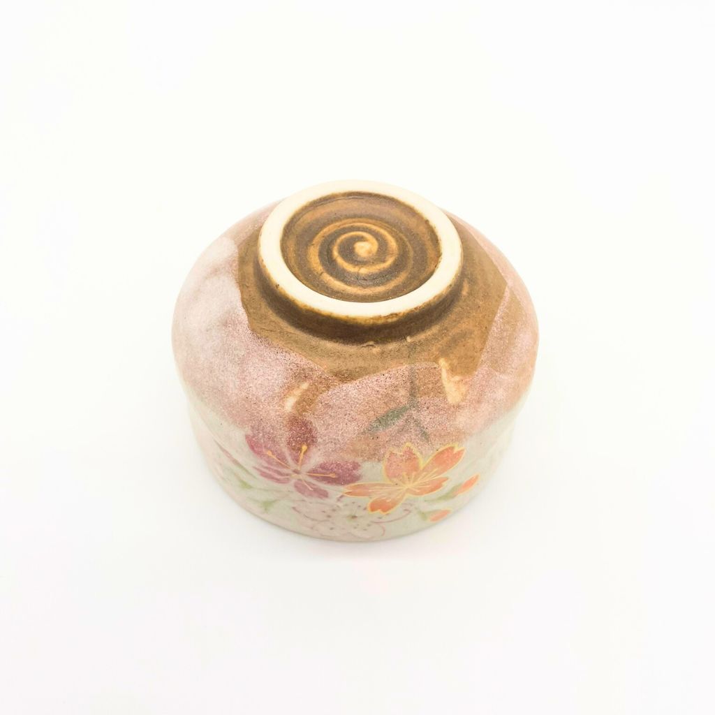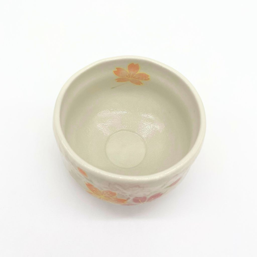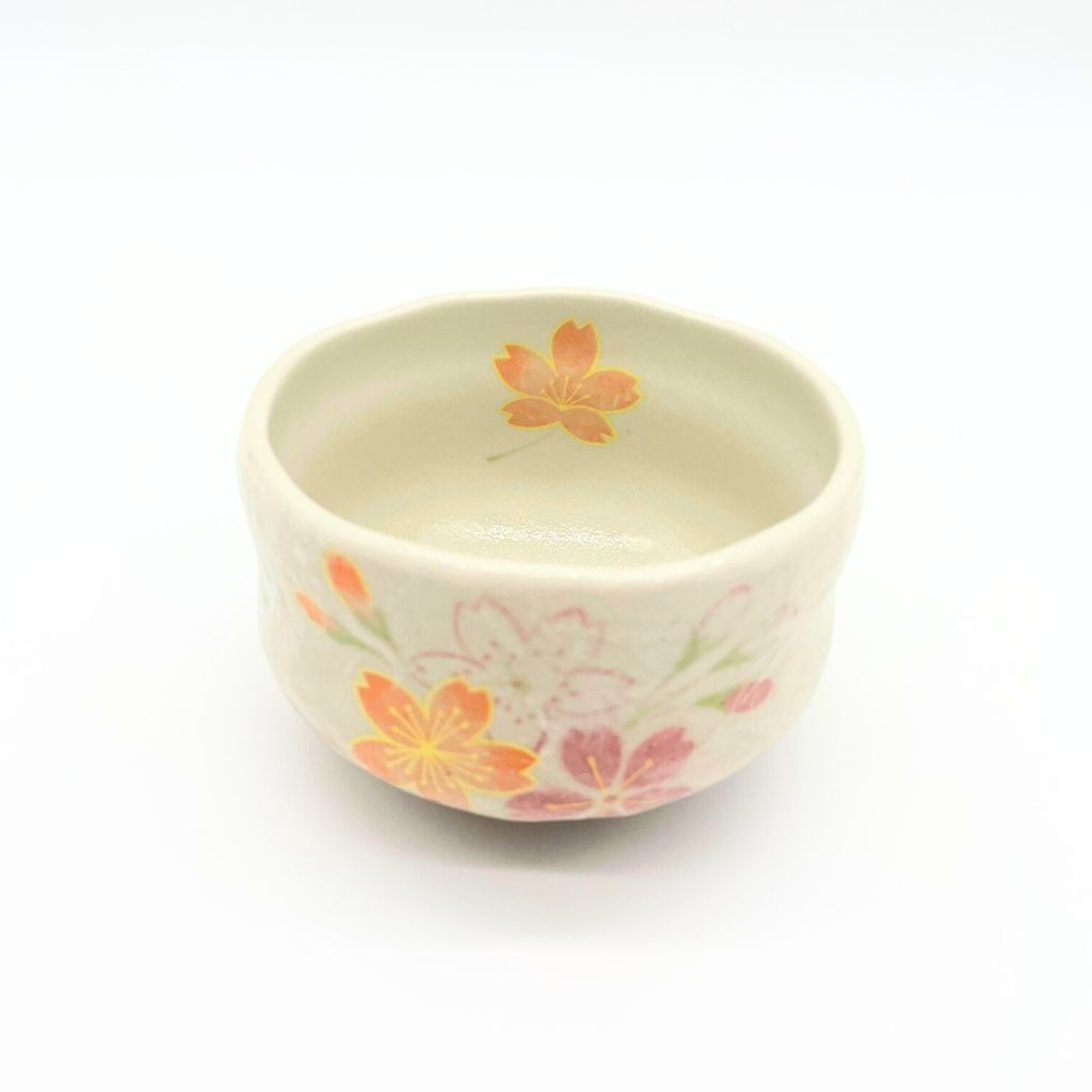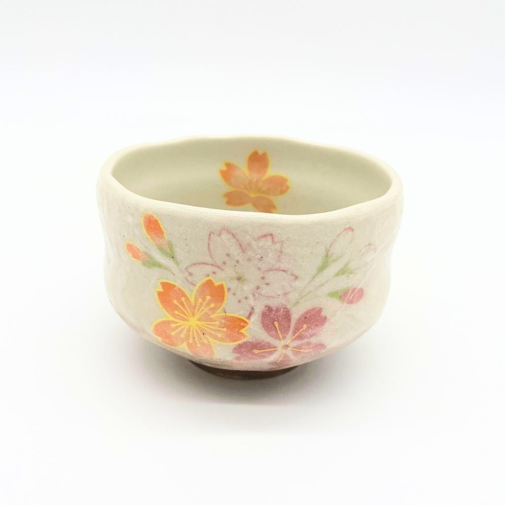 A bold and expressive chawan born from Mino’s celebrated pottery tradition. The surface is adorned with vibrant kikyo (Japanese bellflowers) in tones of orange and red, applied with a striking sponge-glaze technique that brings depth and movement to the floral design.